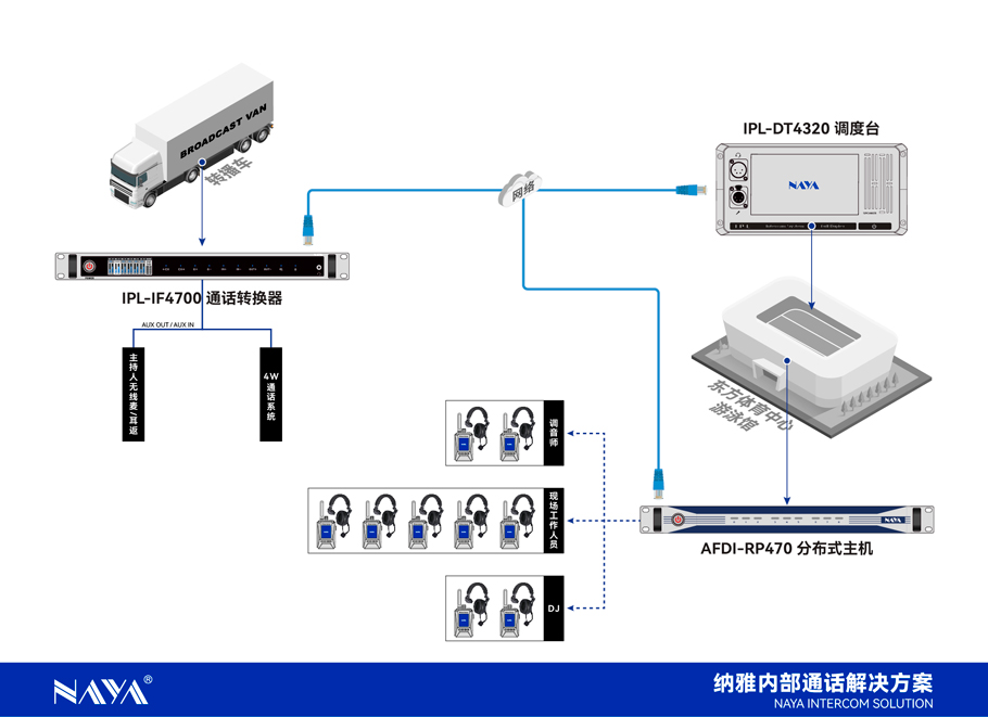 通过我们的内部通话转换器,连接aux接口,将主持人的耳返系统与无线麦系统接入到我们的内部通话系统中,并分配到一个无线组里,方便导播与主持人之间随时沟通,掌控现场比赛情况,保证现场比赛顺利进行。同时通过四线通道与转播车进行音频对接,保障导播与车内人员无障碍交流,保证现场比赛情况实时向外部传播。