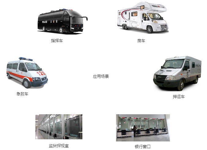 无需单独布线,满足高端车载要求,没有安装费用。适合各种隔屏房车,指挥车,特种车,银行系统,监狱等。