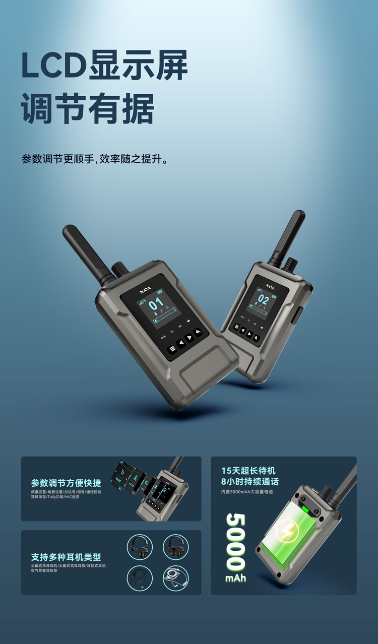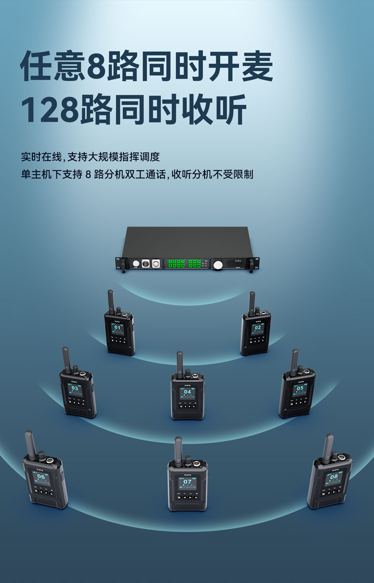 上海纳雅智能科技有限公司在自主技术wDR无线全双工数字语音通话技术基础上,新开发了wDR-8技术,能支持1个主机和最多8个分机同时听说。FDI-BS350型号专门为现场多部门联合工作指挥调度通话的使用目的而设计,分成指挥专用信道和8个公用信道,从而构成8路全双工语音调度系统;指挥主机可随时发起语音通话,能够选择允许通话的分机。特别地,允许工作人员根据部门分成组,每个组内都可以自由双向通话而不影响其他的部门。 现场影片制作时,导演与摄影、灯光及音效人员需要有效的联系,才能完成一部好的制作过程和内容。HDI-BS350导播通话系统,导演具有统揽全局的最高权限,可以随时控制分组行为,选择与哪些分机或分组通话,发出指令,只有被选中的部门或人员才能与导演通话。其他未被选中的部门可以自行内部通话,而不影响其他部门的通话。 比如,导演主机可以选择暂时屏蔽某些分机,比如,关闭主持人使用的分机,避免影响到主持人工作。有必要时再打开主持人的分机,就可以与之进行通话。 比如,导演主机可以选择与摄像团队通话,屏蔽灯光、音响部门。此时灯光或音响部门各自内部可以双工通话,自行工作,而不影响其他部门。